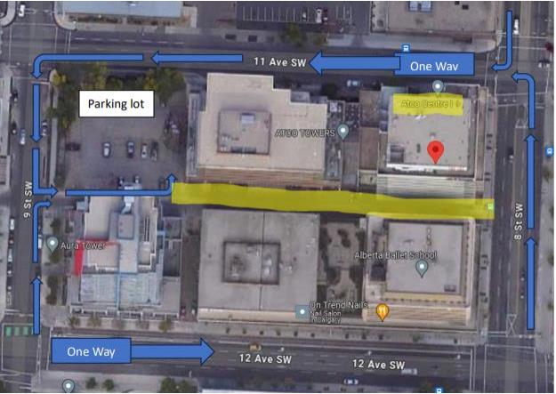 Please see the map below for our new client parking lot beside the ATCO Towers. The parking lot can be accessed through the alley. Access to the alley is from 9th or 8th Street. Please note that 11th Avenue is a one-way westbound, and 12th Avenue is a one-way eastbound. Once at the entrance to the lot, press the button and wait for the arm to raise. This may take a moment.